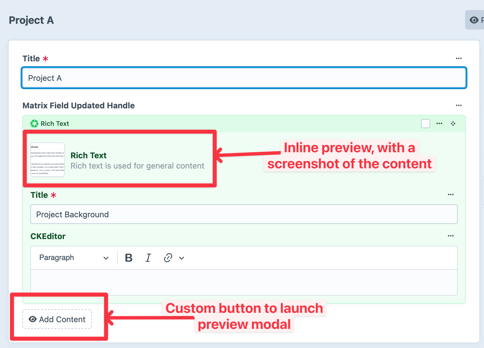 Once configured, you will begin to see the Matrix Field Preview "modal button" and "inline previews" appear in the matrix fields within your entry types.