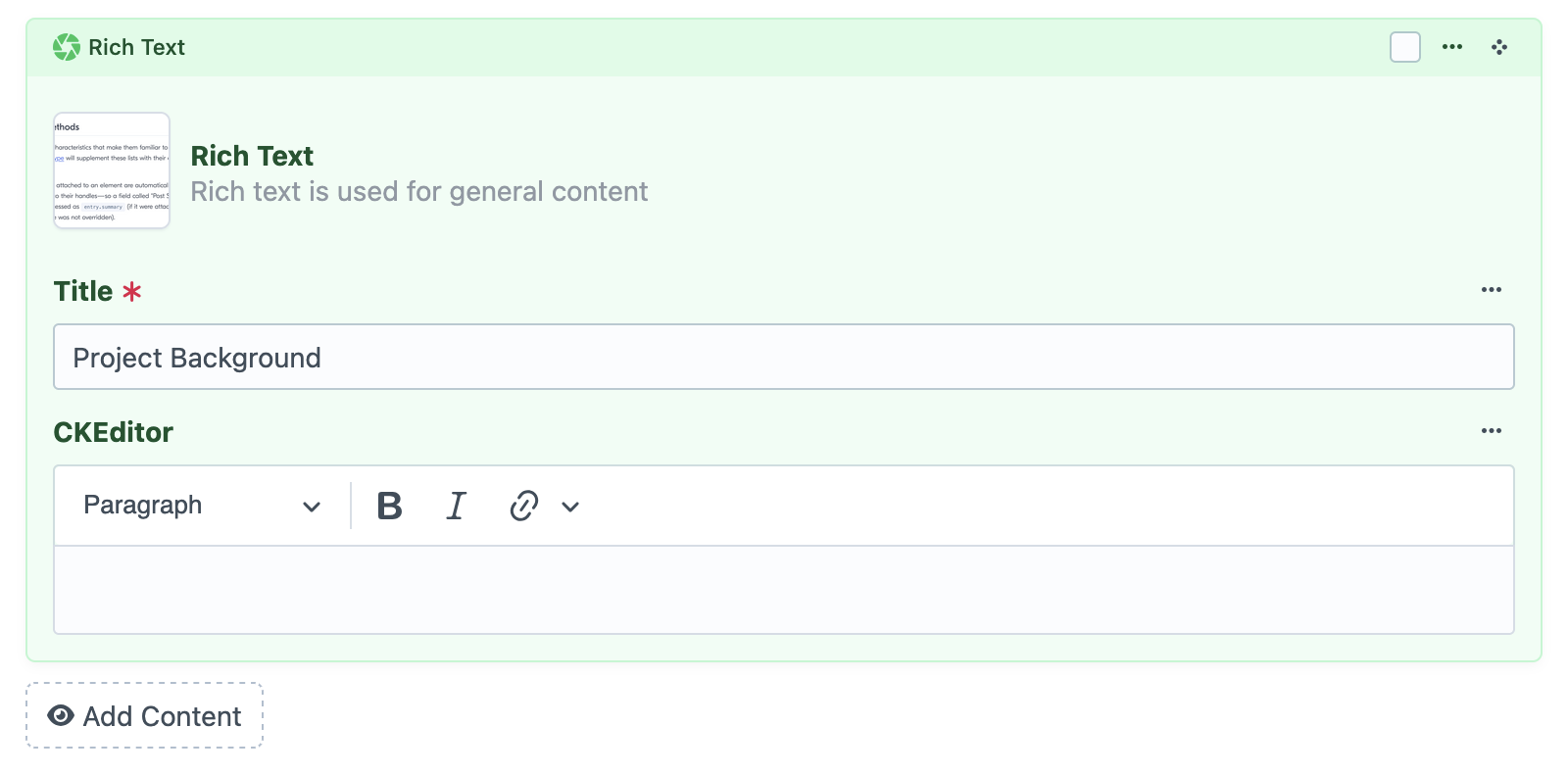 When editing entries in the Craft CMS control panel, there will now be "inline" preview images for all matrix field blocks. These are small thumbnail images alongside the title & description: